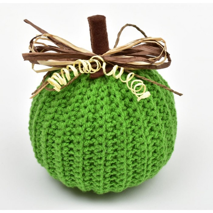 Декоративна плетена тиква в зелен цвят. Тиквата е ръчно изработена на една кука и напълнена със силиконов пух. Тиквата е чудесна есенна декорация за дом, украса на маса, за детско забавление или празничен подарък. Размери: 14 см. диаметър, 14 см. височина.Артикул 5577..