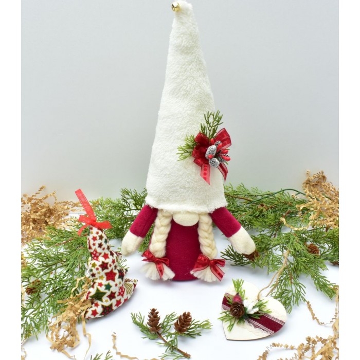 Коледното гномче е изработено от полар, кох, силиконов пух и вълна. Високо е 35 см.