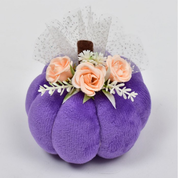 Текстилна тиква подходяща за декорация на вашия дом.Ръчно изработена от плюш, филц, тюл,  изкуствени цветя за декорация и пълнеж от силиконов пух.Размер 11 см./10 см. Артикул 5578..