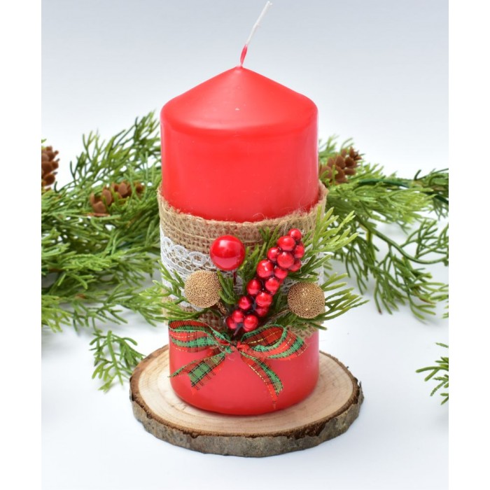 Коледна свещ с ръчно изработена декорация. Подходяща е за подарък за настъпващите коледни и новогодишни празници.