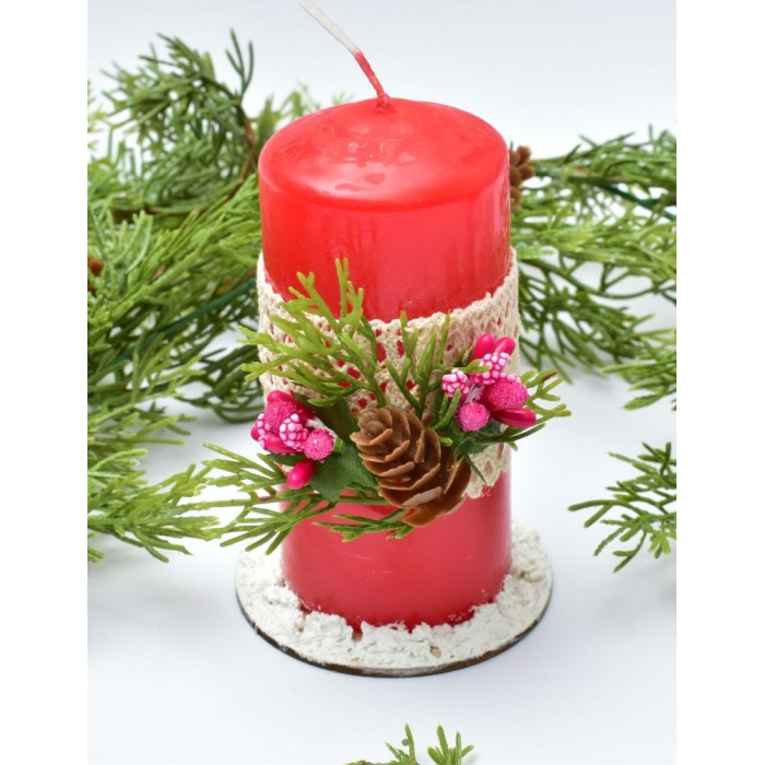 Коледна свещ с ръчно изработена декорация. Подходяща е за подарък за настъпващите коледни и новогодишни празници.