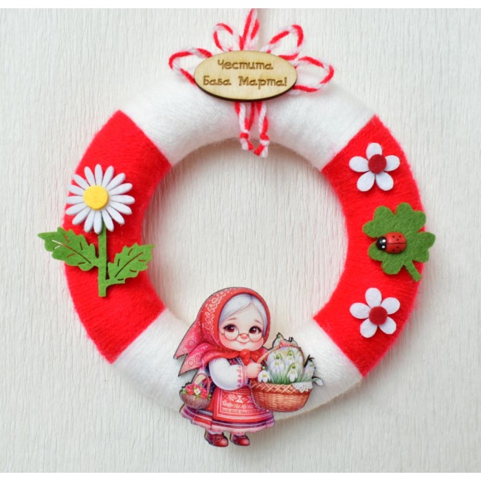 Ръчно изработен мартенски венец с прежда, филц и дървени елементи.