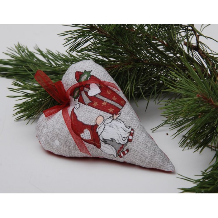 Ръчно изработена от висококачествени платове, силиконов пух и панделка. Висока е 15 см. Подходяща за украса на елхата и дома. Артикул 2932..