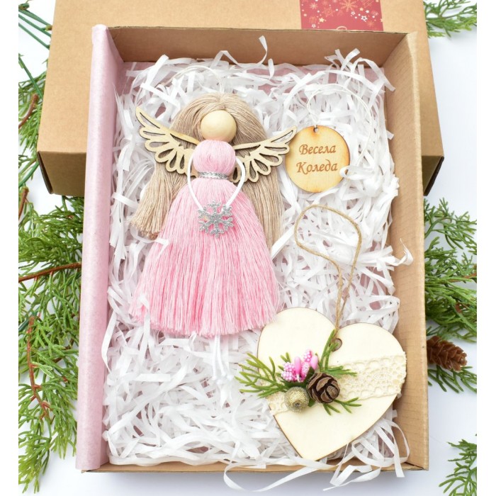 Ръчно изработено коледно ангелче, ръчно декорирана коледна играчка и подарък декоративна украса за елхата.Ще ги получите опаковани в кутия с панделка, готова за подаряване.Артикул 5642..