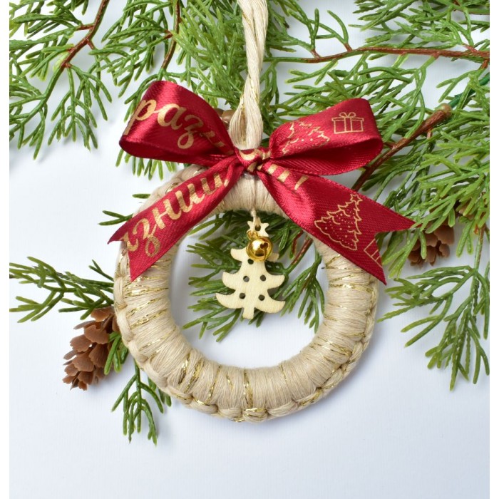 Материали: дървена халка, прежда макраме, дървена елхичка, камбанка и панделка.