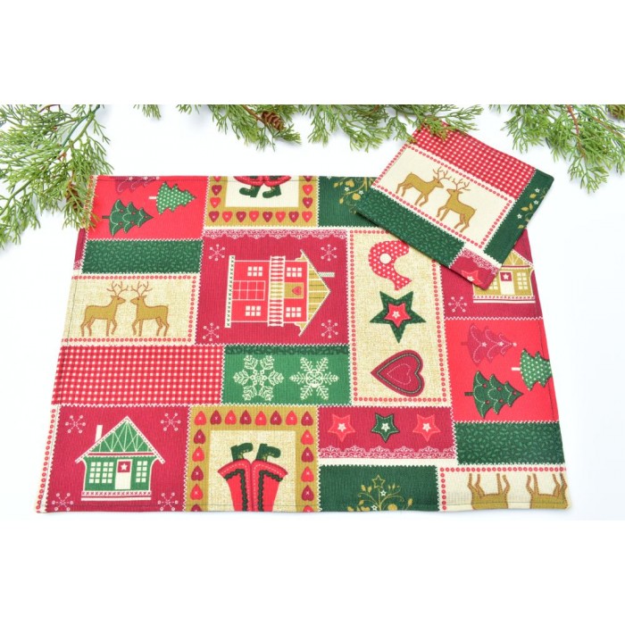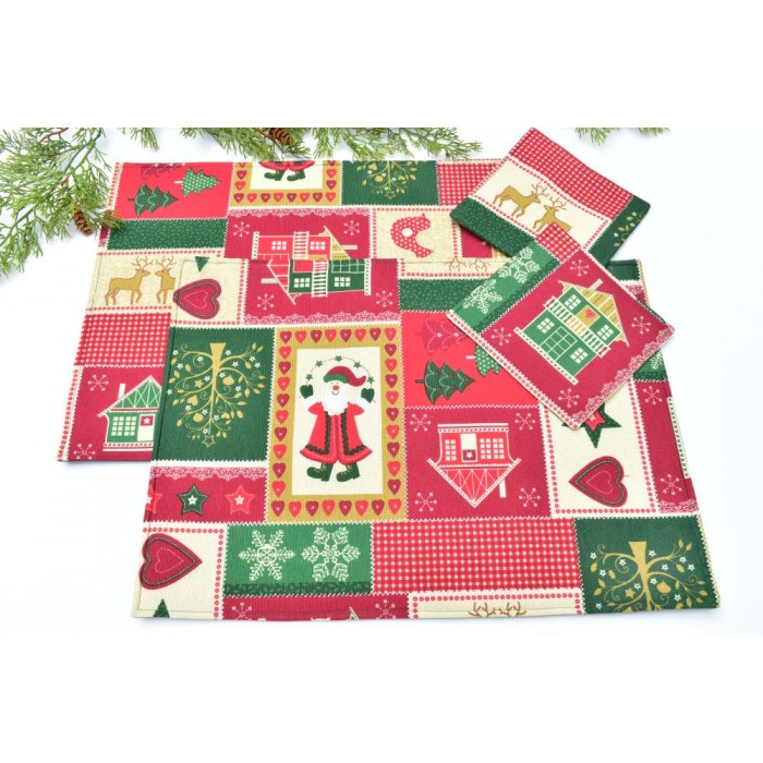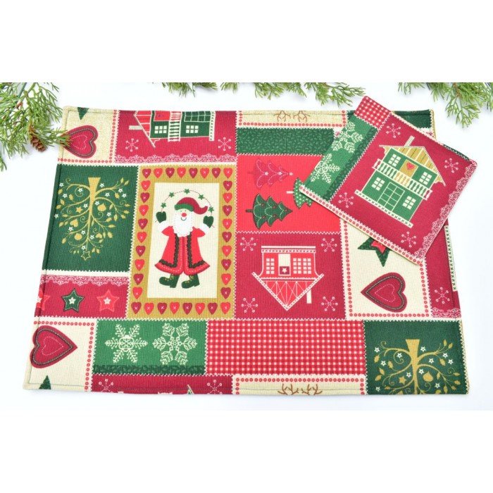 Текстилен коледен комплект от две подложки за хранене и две подложки за чаши. Размери на големите подложки 29 см./ 40 см. Размери на подложките за чаши 13 см./ 14 см. Изработени от висококачествени платове и юталин. Артикул 5702..